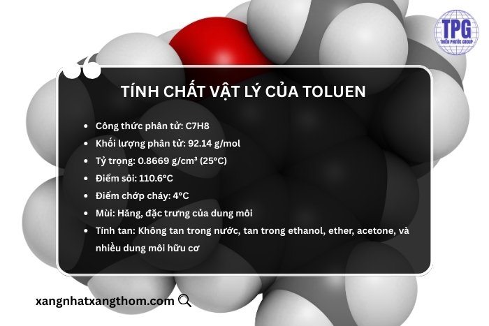 Toluene là một hợp chất hydrocarbon thơm, có công thức hóa học C7H8, còn được gọi là methylbenzene. Đây là một chất lỏng không màu, dễ bay hơi, có mùi đặc trưng giống sơn hoặc keo.